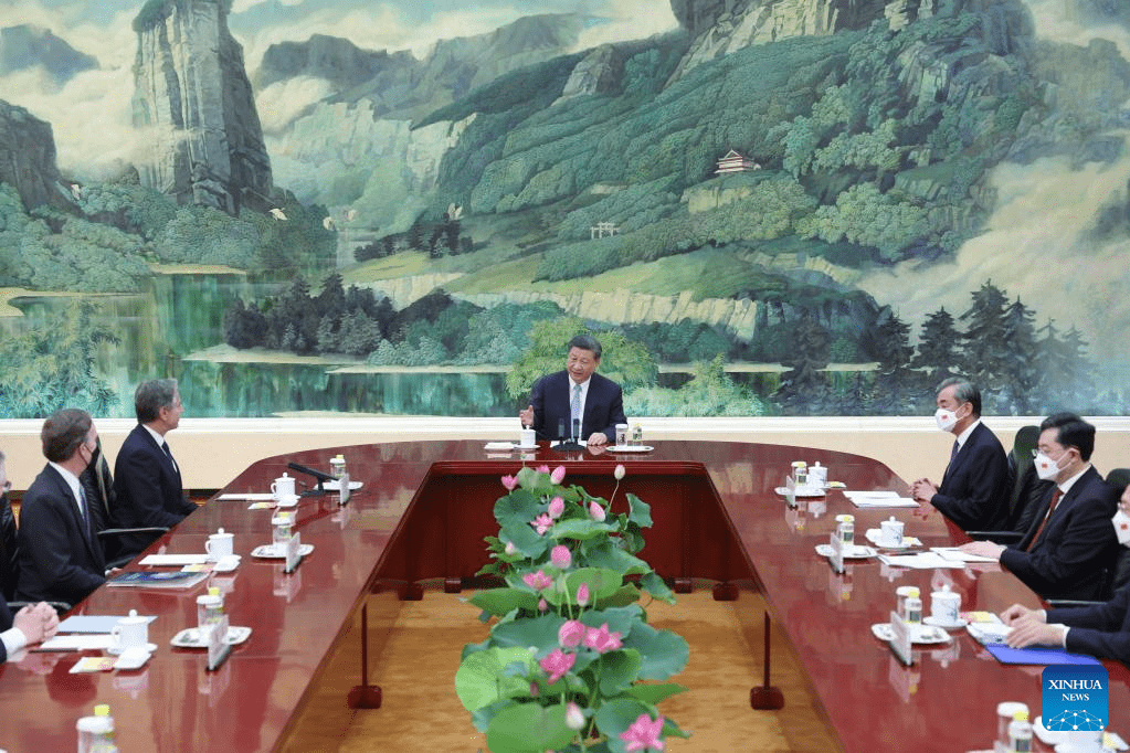 Sekretari i Shtetit i ShBA-së Antony Blinken, nga ana e tij, i përcolli presidentit Xi Jinping përshëndetjet e presidentit Joe Biden. Ai tha që presidenti Biden beson se ShBA-ja e Kina kanë përgjegjësinë dhe detyrimin për trajtimin si duhet të marrëdhënieve dypalëshe, çka përputhet me interesat e ShBA-së e të Kinës, dhe madje të mbarë botës. Pala amerikane është e përkushtuar për kthimin në agjendën e përcaktuar në takimin ndërmjet dy udhëheqësve në ishullin Bali të Indonezisë. ShBA-ja respekton premtimin e bërë nga presidenti Biden, d.m.th. nuk kërkon “Luftë të Ftohtë të re”, ndryshimin e sistemit të Kinës dhe kundërvënien ndaj Kinës ndërmjet forcimit të aleancave, nuk përkrah “pavarësinë e Tajvanit” dhe nuk synon konflikt me Kinën. Po ashtu, pala amerikane shpreson të zhvillojë kontaktet e nivelit të lartë me Kinën, të ruajë shkëmbimet e lirshme, të kontrollojë mosmarrëveshjet në mënyrë të përgjegjshme dhe të synojë dialogun, shkëmbimet e bashkëpunimin.