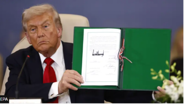 Ky është versioni i plotë i marrëveshjes për paqe në Rripin e Gazës, e nënshkruar më 13 tetor 2025 nga Presidenti Donald Trump, Presidenti i Egjiptit Abdel Fattah al-Sisi, Emir i Katarit Tamim bin Hamad Al-Thani dhe Presidenti i Turqisë Recep Tayyip Erdogan…-