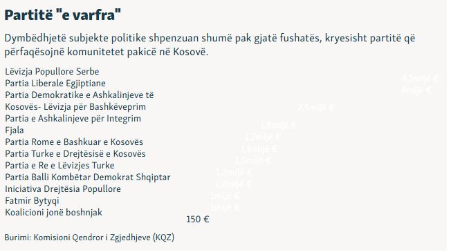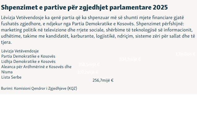 Vetëm pesë partitë kryesore – Lëvizja Vetëvendosje, Partia Demokratike e Kosovës, Lidhja Demokratike e Kosovës, Aleanca për Ardhmërinë e Kosovës/Nisma dhe Lista Serbe – shpenzuan rreth 3.6 milionë euro, sipas të dhënave që publikoi Komisioni Qendror i Zgjedhjeve.