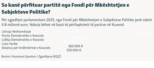 Sipas të dhënave të Komisionit Qendror të Zgjedhjeve, nga 16 gushti 2024 deri më 9 shkurt 2025, LVV ka deklaruar të hyra mbi 1.1 milion euro, PDK-ja mbi 559 mijë euro, LDK-ja mbi 94 mijë euro dhe AAK-ja mbi 18 mijë euro.