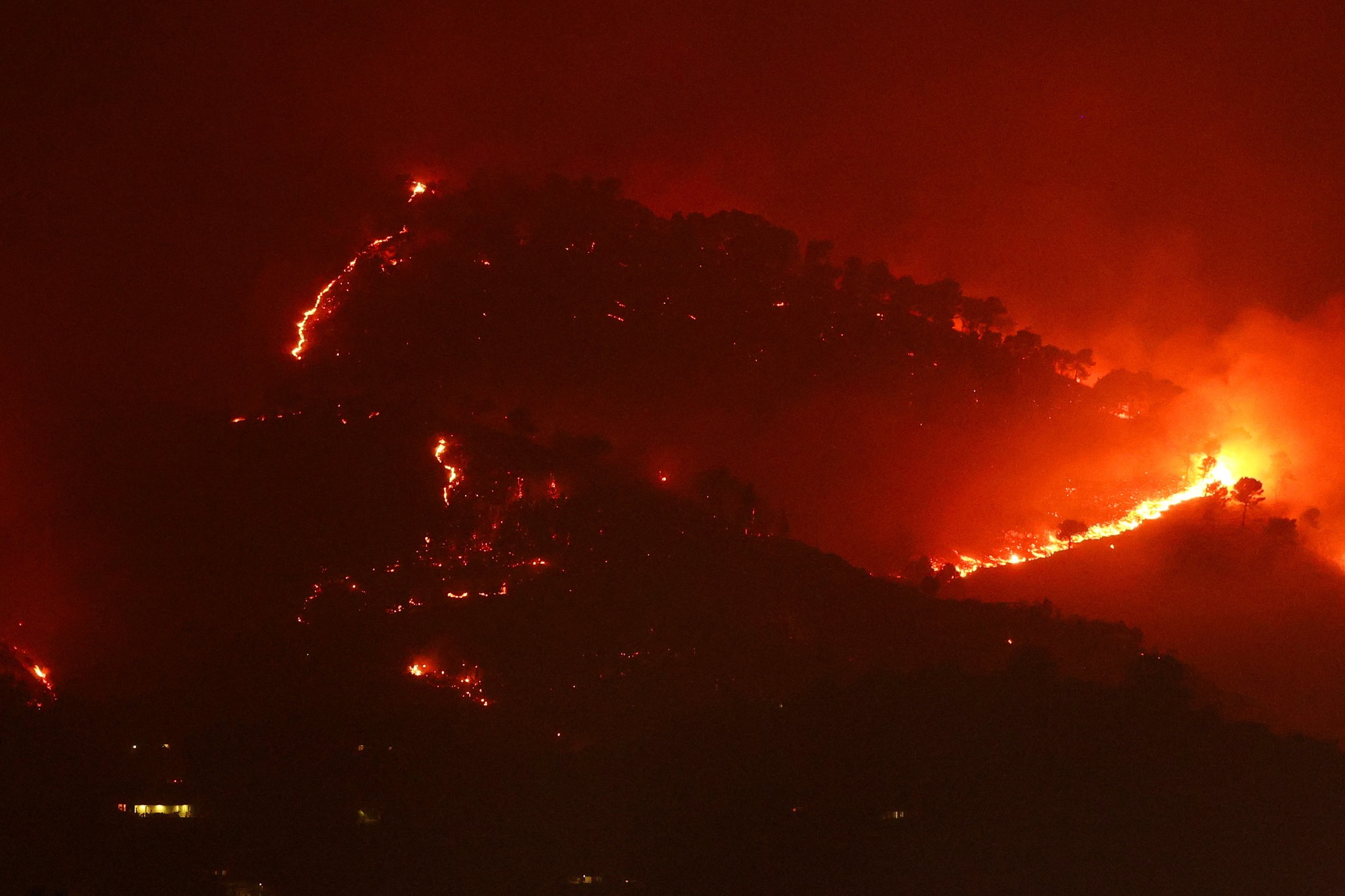 A general view of a wildfire as it continues to burn, in Delvina, Albania, August 12, 2025. REUTERS/Florion Goga