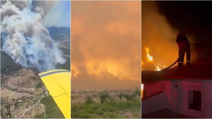 Pamjet e medias treguan ekipe që përdornin traktorë me rimorkio uji dhe helikopterë që transportonin ujë, ndërsa tymi ngrihej mbi kodra të shënuara me pemë të djegura.
