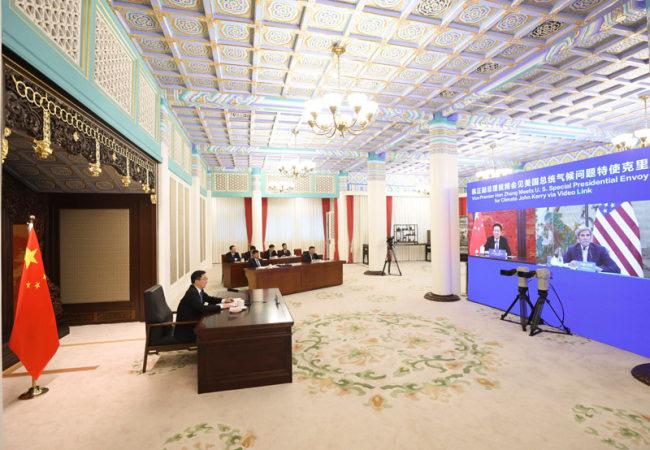 Zëvendëskryeministri kinez Han Zheng u takua me të dërguarin e posaçëm të presidentit amerikan për klimën John Kerry, duke theksuar besimin në bashkëpunimin Kinë-ShBA për ndryshimin e klimës.